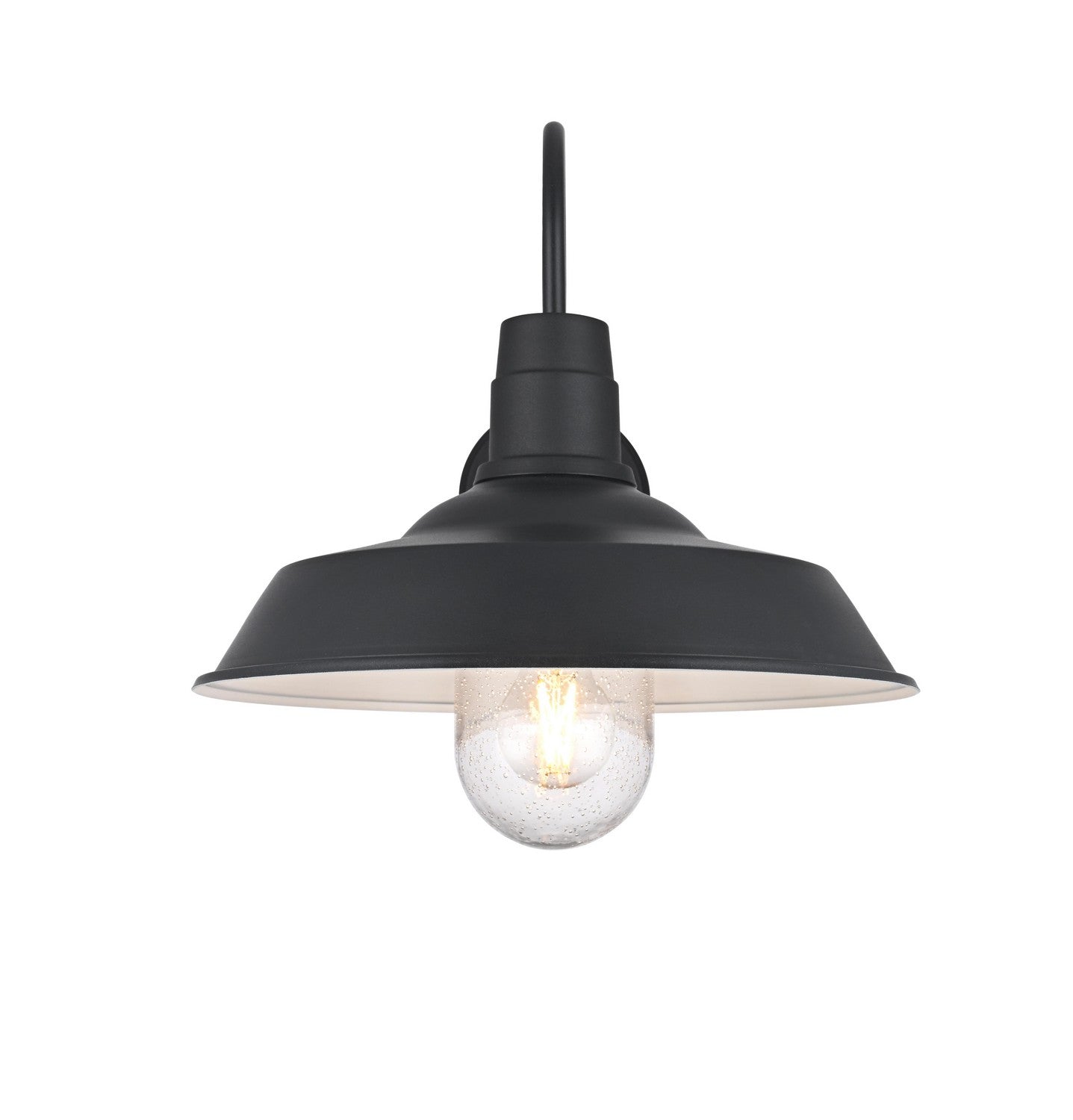 Bring industrial charm and farmhouse character to outdoor spaces with a barn-style wall light that balances vintage appeal with modern functionality. A gracefully curved gooseneck arm extends from the circular backplate, supporting a wide iron shade with a contrasting white interior that maximizes light reflection. The clear seeded glass globe adds a textured, artisanal touch, diffusing the light beautifully while showcasing the bulb inside. Finished in deep matte black, this durable iron sconce is wet rated for all-weather use, making it a perfect choice for patios, porches, garages, and outdoor walkways. Designed with an E26 socket (bulb not included), this versatile outdoor light pairs effortlessly with LED, Edison, or incandescent bulbs to create a warm and inviting ambiance.
