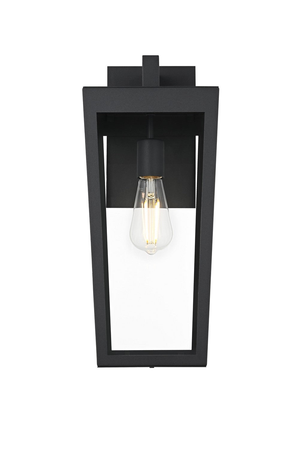Elevate your outdoor lighting with this sleek, modern wall fixture, designed with a refined tapered silhouette and clear glass panels for an airy, sophisticated look. Constructed from durable iron with a floating mount detail, this fixture blends architectural precision with minimalist appeal. The enclosed bottom, secured with a metal plate, adds structural integrity while maintaining a streamlined, finished design. Featuring a standard E26 socket (bulb not included), this light allows for customization in brightness and style. Wet rated for durability against outdoor elements, it is perfect for entryways, patios, and exterior walls. The matte black finish enhances its bold frame, making it a striking statement piece that seamlessly balances form and function.