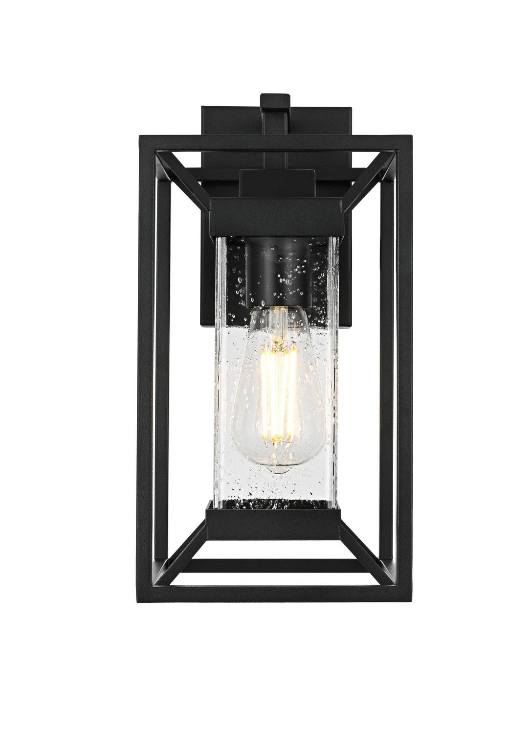 This outdoor wall sconce blends modern simplicity with timeless charm. The sturdy iron frame is designed in a geometric shape, beautifully housing the clear seeded glass that allows the warm glow of the light to shine through. The clear seeded glass adds texture to the illumination, creating an inviting and sophisticated glow that transforms the exterior of your home. With an E26 socket base that easily accommodates standard bulbs, this fixture not only provides style but also high functionality. Whether flanking your front door or lighting up your patio, this sconce elevates your outdoor space with a crisp, contemporary look that is both durable and refined.