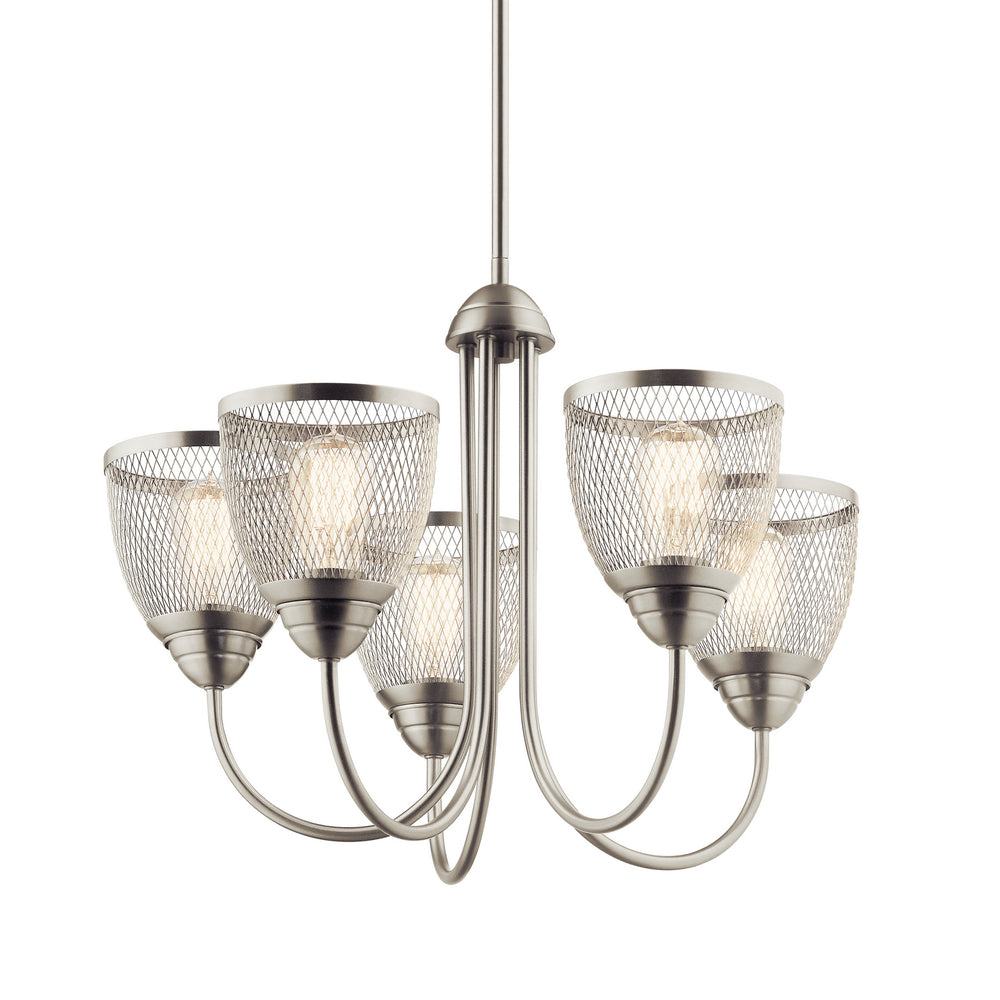 The Voclain(TM) 17.5in. 5 light chandelier features a distinctive industrial look with its Brushed Nickel metal mesh shade. A perfect addition in several aesthetic environments including industrial, contemporary and transitional.Kichler Five Light Chandelier in Brushed Nickel | Fan DiegoFive Light Chandelier by Kichler in Brushed Nickel from the Voclain collection. Save on the largest selection of Kichler Mid. Chandeliers with free shipping deals.52269NIBrushed Nickel2417.54.75 DIA575A19E26 MediumIncandescentYesNo120 Volt["Steel"]SteelcETLusDryNoEAMid. Chandeliers19" - 24"13" - 18"$200-$300Ni Metal Mesh Shade36``120"NoNoNoOne (1) year from the date of purchaseNoNo6.6NoCNNoNoNo09/13/2023OtherPewter, Nickel, SilverTransitionalMid. ChandeliersOtherTransitional211.422.2520.512.253.27UPS