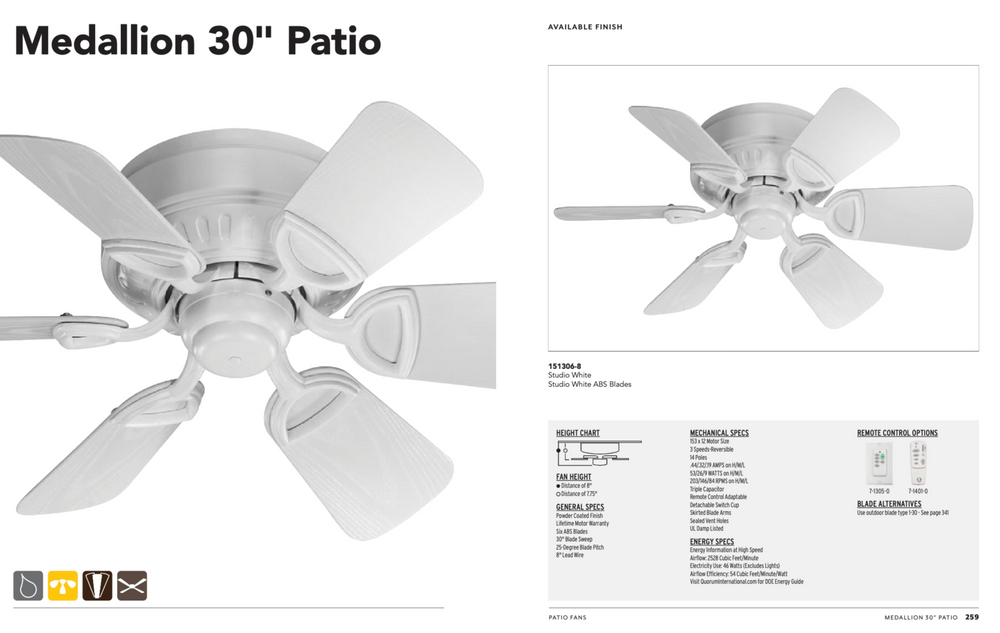 The Quorum Medallion 30" Patio Fan is a versatile addition to any indoor or outdoor space. Designed for convenience, its flush mount allows for easy installation on any ceiling. Plus, its damp-listed feature ensures durability even in areas with moisture. Stay cool and chic with its three-speed pull chain and manual reversing switch.