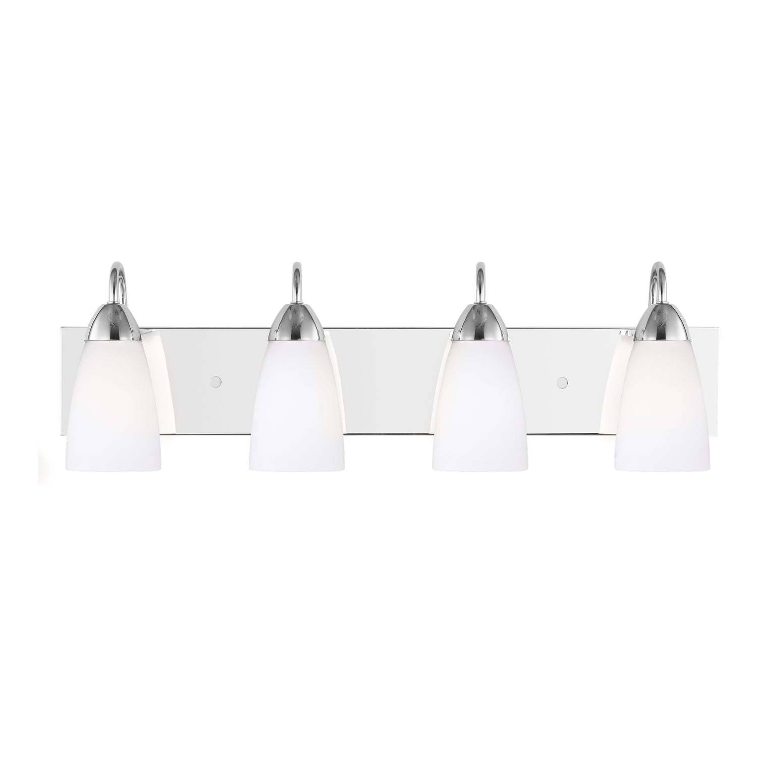 The Seville four light vanity fixture in chrome offers shadow-free lighting in your powder room, spa, or master bath room. The Seville collection represents commitment to high style at a sharp price. The modernist design is epitomized by the teardrop curves in the arms tipped by Etched glass diffusors throughout the chandeliers and bath fixtures. The collection offers a '' whole home'' lighting solution in every imaginable category. The assortment includes nine-light, five-light, and three-light chandeliers (either with up-light or down-light), pendants in four sizes as well as one-light, two-light, three-light , four-light and five-light wall/bath fixtures. Install a stylish and elegant addition to any room in the house. Seville is offered in Brushed Nickel and Burnt Sienna finishes.Generation Lighting. Four Light Wall / Bath in Chrome | Fan DiegoFour Light Wall / Bath by Generation Lighting. in Chrome from the Seville collection. Save on the largest selection of Generation Lighting. Bathroom Fixtures with free shipping deals.4420204-05Chrome["Bathroom", " Bedroom", " Entry Room/Hallway"]Bathroom, Bedroom, Entry Room/HallwayBathroomBedroomEntry Room/Hallway28.388.5DP:5/8'' W:28 3/8'' H:4 3/4'' OB UP:5 1/8'' OB DOWN:3 3/8'' Rectangular475A19MediumNoNo120 Volt["Steel"]SteelcETLDampNoEABathroom Fixtures25'' - 30'' 7'' - 12'' $100-$200Etched / White Inside6.5'' Black/WhiteNoNoNoNo6.63HardwiredNo7.94NoPhillippinesNoYesNohttp://www.SeaGullLighting.com/58343/4420204%2D05.HTMLhttps://v1.generationlighting.com/i/SFMC%20Images/SGL/SpecSheets/4420204-05.pdf06/15/2023Four LightsChromeTransitionalBathroom FixturesFour LightsTransitional210.230.58.259.751.46Parcelhttps://v1.generationlighting.com/i/SFMC%20Images/SGL/InstructionSheets/990W4_2020_-SVE.pdf