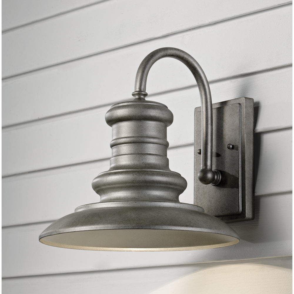 The Redding Station one light outdoor wall fixture in tarnished silver creates a warm and inviting welcome presentation for your home's exterior. All Aboard! Reminiscent of old railroad lighting, the Redding Station Collection warmly illuminates its surroundings with a vintage railroad vibe. The all-aluminum shades feature textured details. Redding Station is available in three finish options: Tarnished Silver, Restoration Bronze and Textured Black.