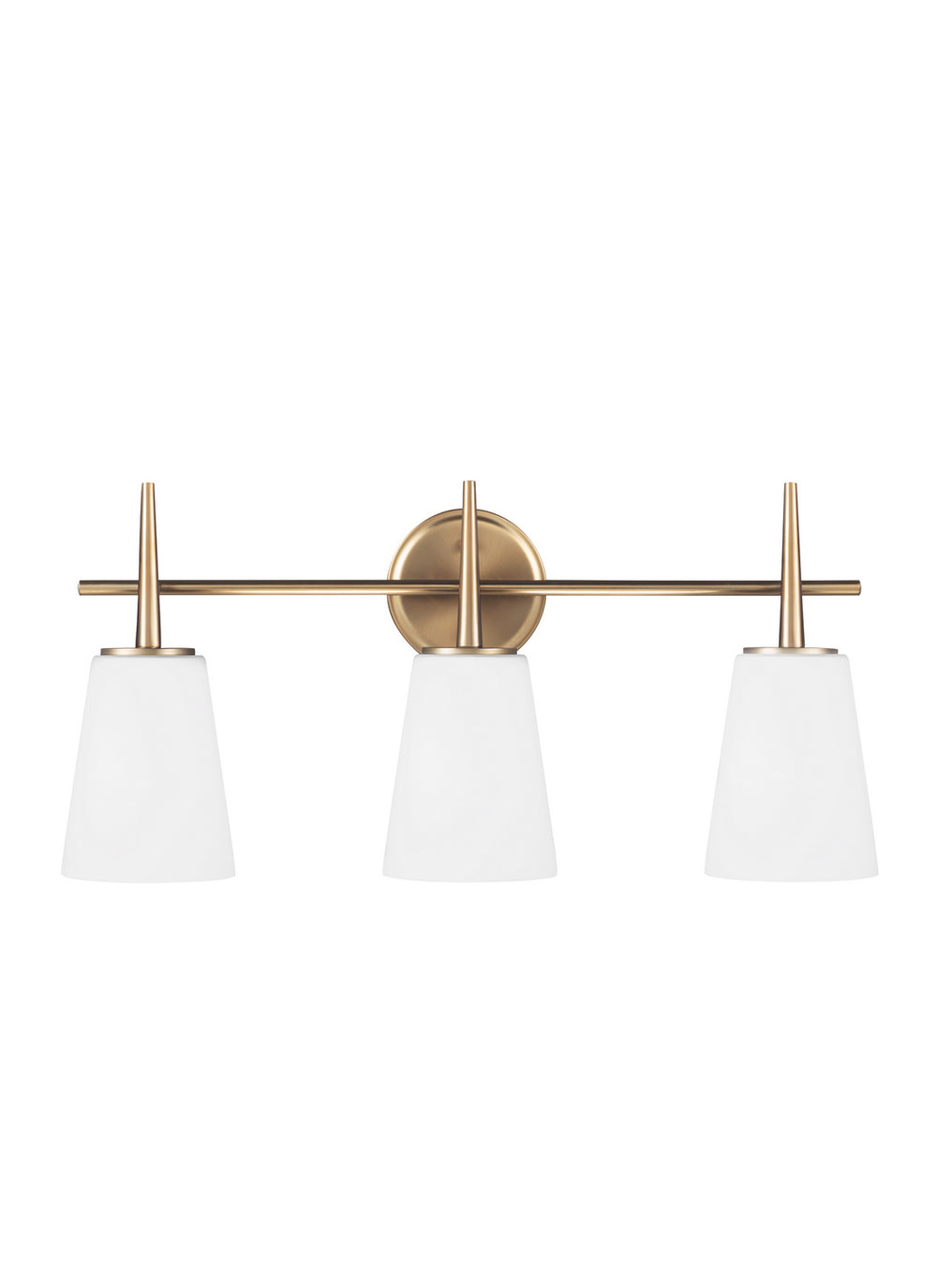 The Driscoll three light vanity fixture in satin brass provides abundant light for your bath vanity, while adding a layer of today's style to your interior design. The 1960âs-inspired Driscoll collection by features the clean lines of tapered stems and glass shades. Simplicity combined with sophistication creates this strikingly modern look. Offered in a Brushed Nickel finish in addition to the Chrome finish also offered for wall/bath fixtures all of which feature Etched White glass shades. The assortment includes nine-light, five-light and three-light chandeliers, a mini pendant, as well as one-light, two-light, three-light and four-light wall/bath fixtures. Both incandescent lamping and ENERGY STAR-qualified LED lamping are available, all fixtures are California Title 24 compliant.Generation Lighting. Three Light Wall / Bath in Satin Brass | Fan DiegoThree Light Wall / Bath by Generation Lighting. in Satin Brass from the Driscoll collection. Save on the largest selection of Generation Lighting. Bathroom Fixtures with free shipping deals.4440403-848Satin Brass["Bathroom", " Bedroom", " Entry Room/Hallway"]Bathroom, Bedroom, Entry Room/HallwayBathroomBedroomEntry Room/Hallway24.512D:5'' DP:1'' OB UP:3 1/4'' OB DOWN:8 3/4'' Round3100A19MediumNoNo["Steel"]SteelETLDampNoEABathroom Fixtures19'' - 24'' 7'' - 12'' $200-$300Cased Opal Etched6.5'' Black/WhiteNoNoall fixtures are California Title 24 compliant.'' No1 Year Warranty for standard fixturesNo7HardwiredNo6.2NoChinaNoYesNohttp://www.SeaGullLighting.com/33638/4440403%2D848.HTMLhttps://v1.generationlighting.com/i/SFMC%20Images/SGL/SpecSheets/4440403-848.pdf06/15/2023Three LightsBronze / DarkTransitionalBathroom FixturesThree LightsTransitional28.2271013.752.15Parcelhttps://v1.generationlighting.com/i/SFMC%20Images/SGL/InstructionSheets/990W4_4040_-DRI.pdfWhite