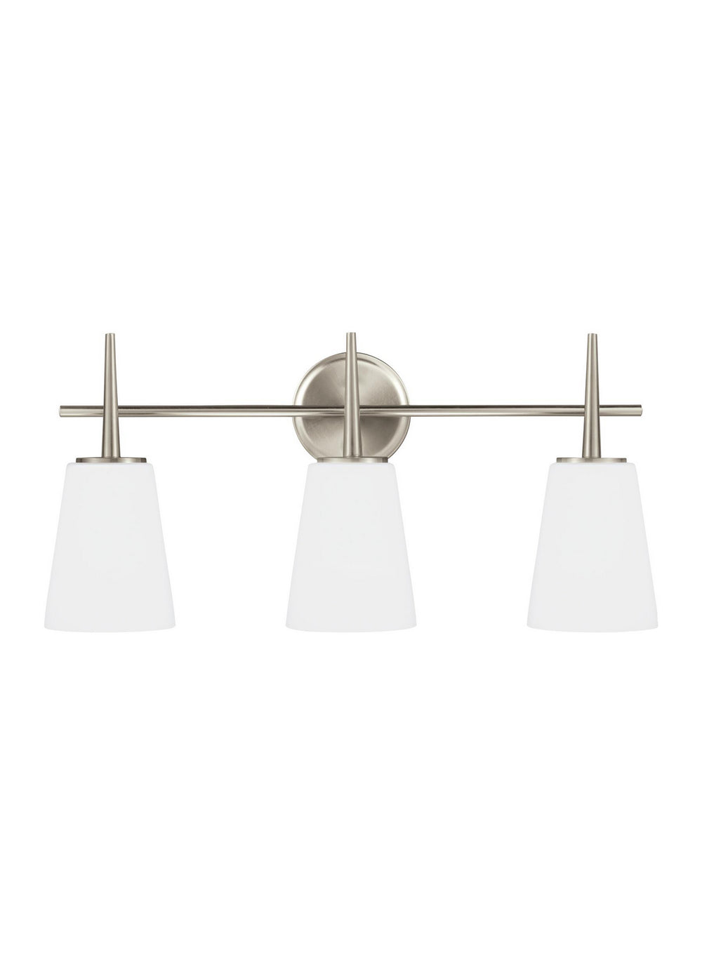 The Driscoll three light vanity fixture in brushed nickel offers shadow-free lighting in your powder room, spa, or master bath room. The 1960âs-inspired Driscoll collection by features the clean lines of tapered stems and glass shades. Simplicity combined with sophistication creates this strikingly modern look. Offered in a Brushed Nickel finish in addition to the Chrome finish also offered for wall/bath fixtures all of which feature Etched White glass shades. The assortment includes nine-light, five-light and three-light chandeliers, a mini pendant, as well as one-light, two-light, three-light and four-light wall/bath fixtures. Both incandescent lamping and ENERGY STAR-qualified LED lamping are available, all fixtures are California Title 24 compliant.Generation Lighting. Three Light Wall / Bath in Brushed Nickel | Fan DiegoThree Light Wall / Bath by Generation Lighting. in Brushed Nickel from the Driscoll collection. Save on the largest selection of Generation Lighting. Bathroom Fixtures with free shipping deals.4440403-962Brushed Nickel["Bathroom", " Bedroom", " Entry Room/Hallway"]Bathroom, Bedroom, Entry Room/HallwayBathroomBedroomEntry Room/Hallway24.512D:5'' DP:1'' OB UP:3 1/4'' OB DOWN:8 3/4'' Round3100A19MediumNoNo["Steel"]SteelETLDampNoEABathroom Fixtures19'' - 24'' 7'' - 12'' $200-$300Cased Opal Etched6.5'' Black/WhiteNoNoall fixtures are California Title 24 compliant.'' NoNo7HardwiredNo6.2NoChinaNoYesNohttp://www.SeaGullLighting.com/33639/4440403%2D962.HTMLhttps://v1.generationlighting.com/i/SFMC%20Images/SGL/SpecSheets/4440403-962.pdf06/15/2023Three LightsPewter, Nickel, SilverTransitionalBathroom FixturesThree LightsTransitional28.2271013.752.15Parcelhttps://v1.generationlighting.com/i/SFMC%20Images/SGL/InstructionSheets/990W4_4040_-DRI.pdfWhite