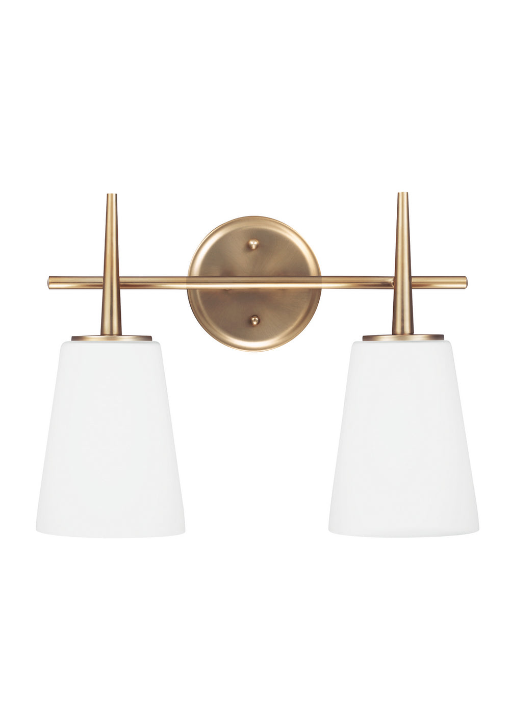 The Driscoll two light vanity fixture in satin brass offers shadow-free lighting in your powder room, spa, or master bath room. The 1960âs-inspired Driscoll collection by features the clean lines of tapered stems and glass shades. Simplicity combined with sophistication creates this strikingly modern look. Offered in a Brushed Nickel finish in addition to the Chrome finish also offered for wall/bath fixtures all of which feature Etched White glass shades. The assortment includes nine-light, five-light and three-light chandeliers, a mini pendant, as well as one-light, two-light, three-light and four-light wall/bath fixtures. Both incandescent lamping and ENERGY STAR-qualified LED lamping are available, all fixtures are California Title 24 compliant.Generation Lighting. Two Light Wall / Bath in Satin Brass | Fan DiegoTwo Light Wall / Bath by Generation Lighting. in Satin Brass from the Driscoll collection. Save on the largest selection of Generation Lighting. Bathroom Fixtures with free shipping deals.4440402-848Satin Brass["Bathroom", " Bedroom", " Entry Room/Hallway"]Bathroom, Bedroom, Entry Room/HallwayBathroomBedroomEntry Room/Hallway15.512D:5'' DP:1'' OB UP:3 1/4'' OB DOWN:8 3/4'' Round2100A19MediumNoNo["Steel"]SteelETLDampNoEABathroom Fixtures13'' - 18'' 7'' - 12'' $100-$200Cased Opal Etched6.5'' Black/WhiteNoNoall fixtures are California Title 24 compliant.'' No1 Year Warranty for standard fixturesNo7HardwiredNo4.3NoChinaNoYesNohttp://www.SeaGullLighting.com/33632/4440402%2D848.HTMLhttps://v1.generationlighting.com/i/SFMC%20Images/SGL/SpecSheets/4440402-848.pdf06/15/2023Two LightsBronze / DarkTransitionalBathroom FixturesTwo LightsTransitional25.7199.25121.22Parcelhttps://v1.generationlighting.com/i/SFMC%20Images/SGL/InstructionSheets/990W4_4040_-DRI.pdfWhite