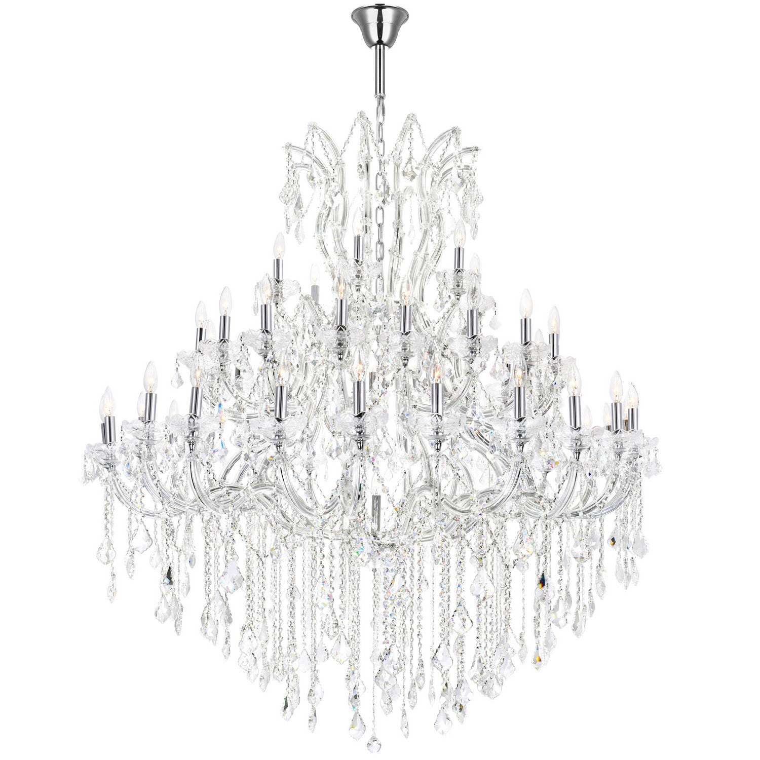 Bring opulent elegance to any room with the stunning Maria Theresa 25-Light Chandelier. Designed to resemble a glamorous candelabra, this exquisite fixture features chrome-finished hardware adorned with cascading crystal strands and dazzling dangling accents. With a 36-inch diameter, this chandelier makes a bold statement in dining rooms, living rooms, or bedrooms, instantly elevating your decor. Perfect for those who love a touch of luxury, it casts a radiant glow that transforms your space into a sophisticated retreat.