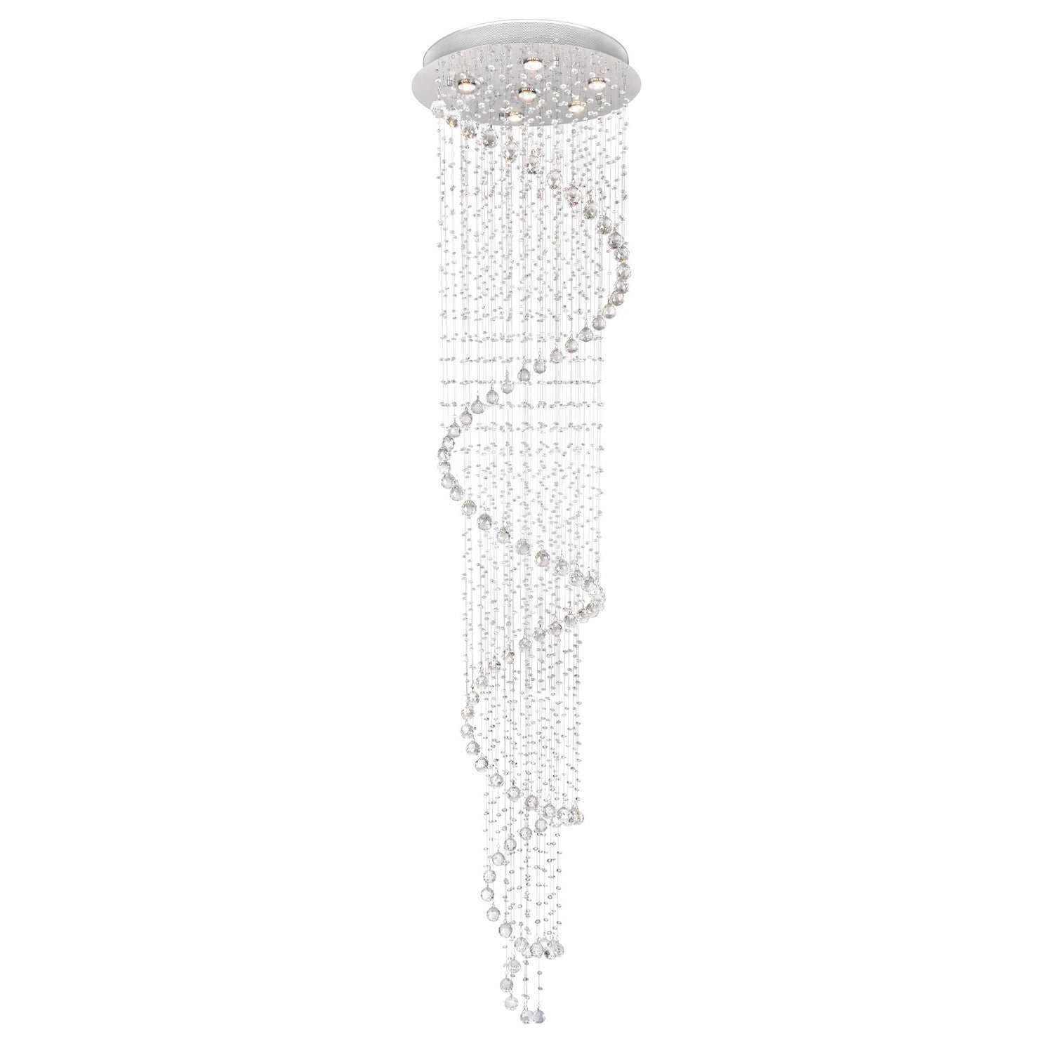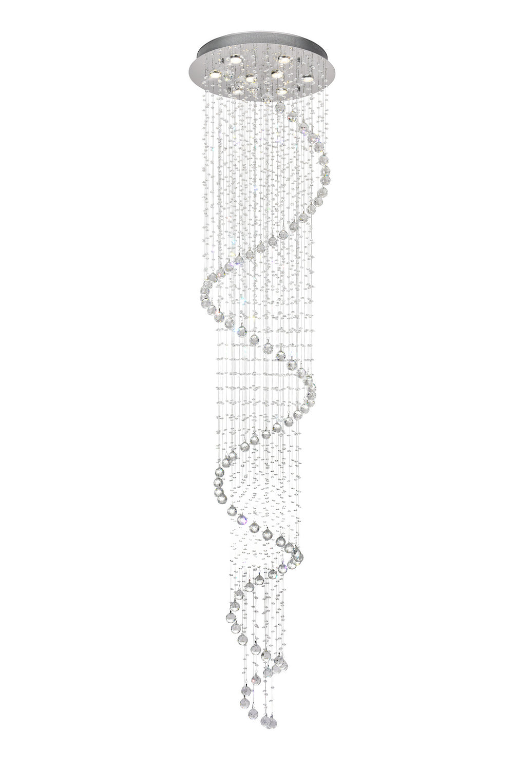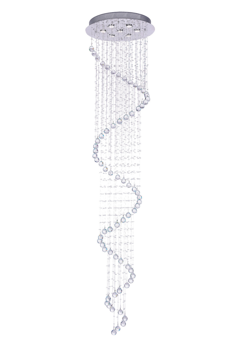 Add an air of elegance to your contemporary home through this Spiral 8 Light Flush Mount Chandelier. Faceted crystal balls that look like spiraling droplets of water are the highlight of this light fixture. A curtain of delicate strands of tiny clear crystals complete the exquisite luster of this piece. Perfect in the dining room, living room, stairwell, or foyer with high ceilings, this glam light fixture won't disappoint.