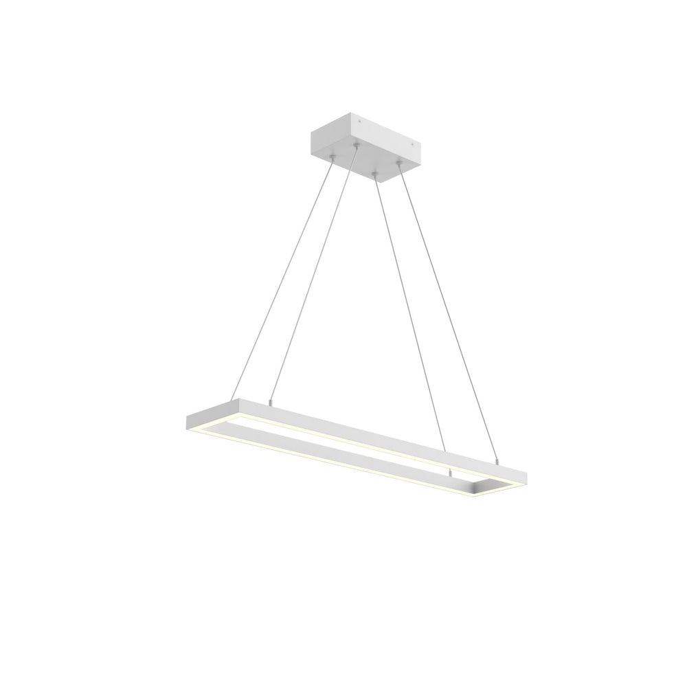 A suspended rectilinear frame emits soft luminance downward from the continuous perimeter opal diffuser. Veiled within the aluminum extrusion is a secondary set of LED lights sending ambient illumination up toward the ceiling. Utilizing a minimal orthogonal outline the PIAZZA series creates an airy effect with the center of the fixture transparent and open. Available as essential singular pendant or dramatic multi-pendant configurations.