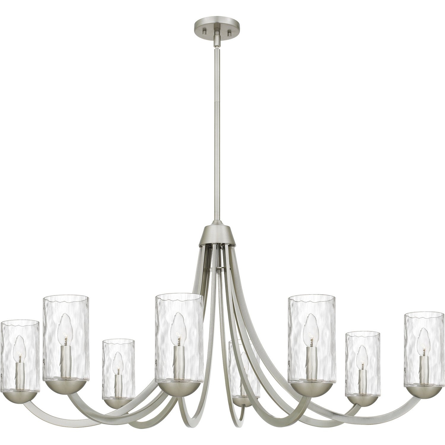 The Allard chandelier is a stunning centerpiece that commands attention. Clear water glass shades add a touch of sophistication and allow the light to shine through brilliantly. Choose from two sizes of chandelier in either matte black or brushed nickel to create a dramatic focal point in any traditional interior setting. Allard's oversized design makes it a great choice for any large dining room or living room space.
