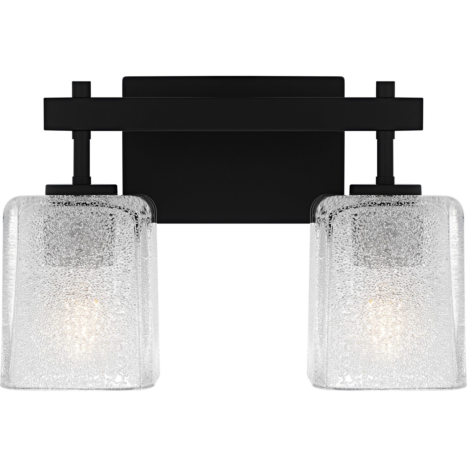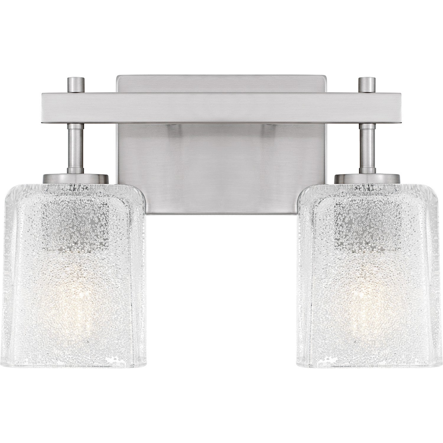 The Brenthouse bath light features a clean, minimalist design with a striking visual impact. Square glass shades cast a soft, diffused glow while adding a touch of texture to the simple silhouette. The thick glass shades feature tiny crystals on the inside, creating a look reminiscent of sparkling sand. The vanity light's slender metal frame, available in a versatile matte black or brushed nickel finish, complements a variety of bathroom styles.