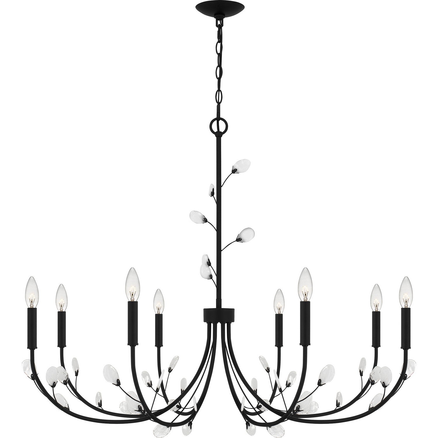 Heiress offers a fresh new take on a classic chandelier design. Choose from a bronze gold finish with light amber swirling glass leaf accents or a matte black finish with clear and white swirling glass leaf accents. All leaves have a little variation due to their unique nature, creating a one-of-a-kind statement piece over any dining room or living room table.