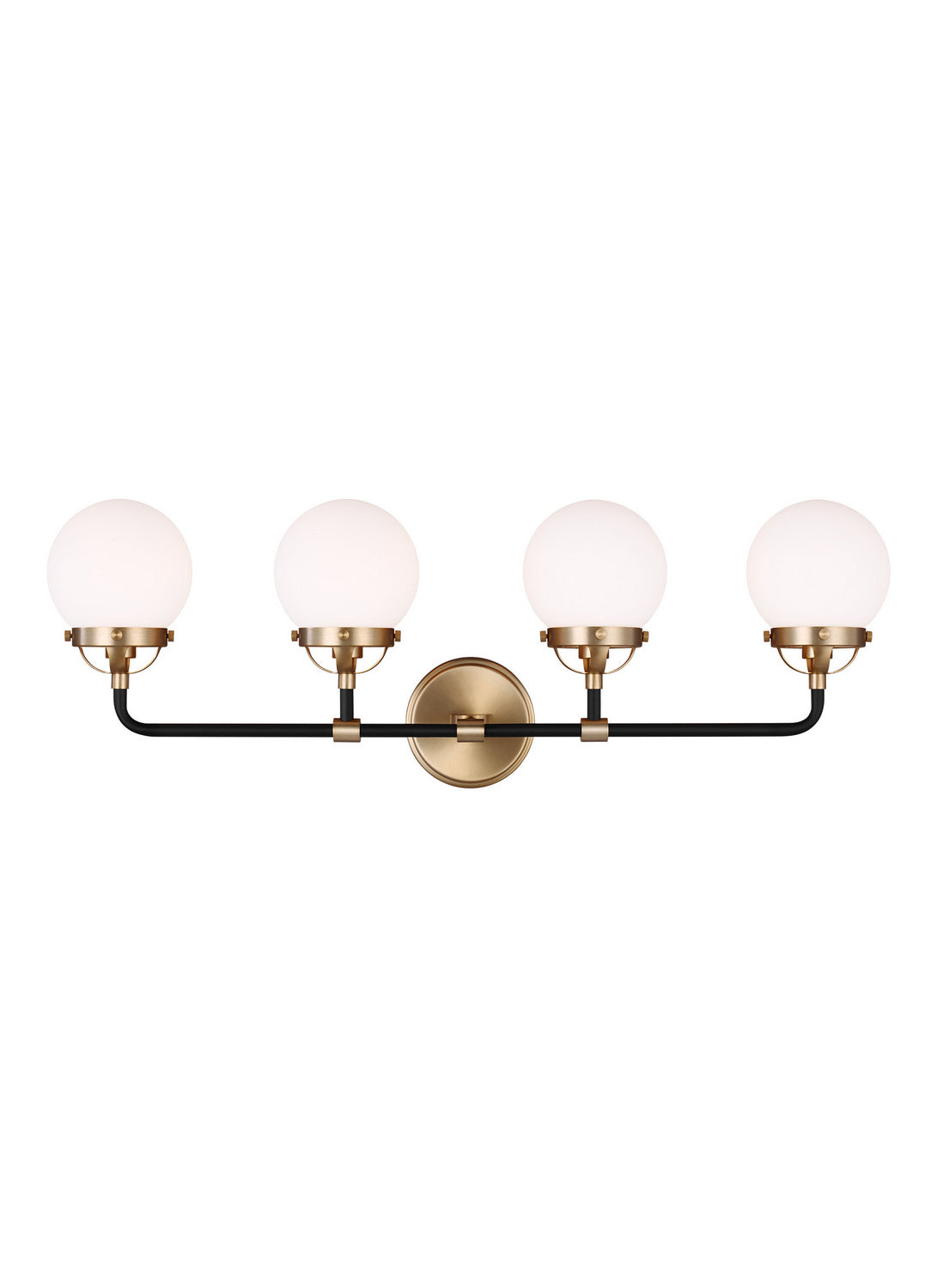 The Cafe four light vanity fixture in satin brass offers shadow-free lighting in your powder room, spa, or master bath room. Â Handsome two-tone finish and