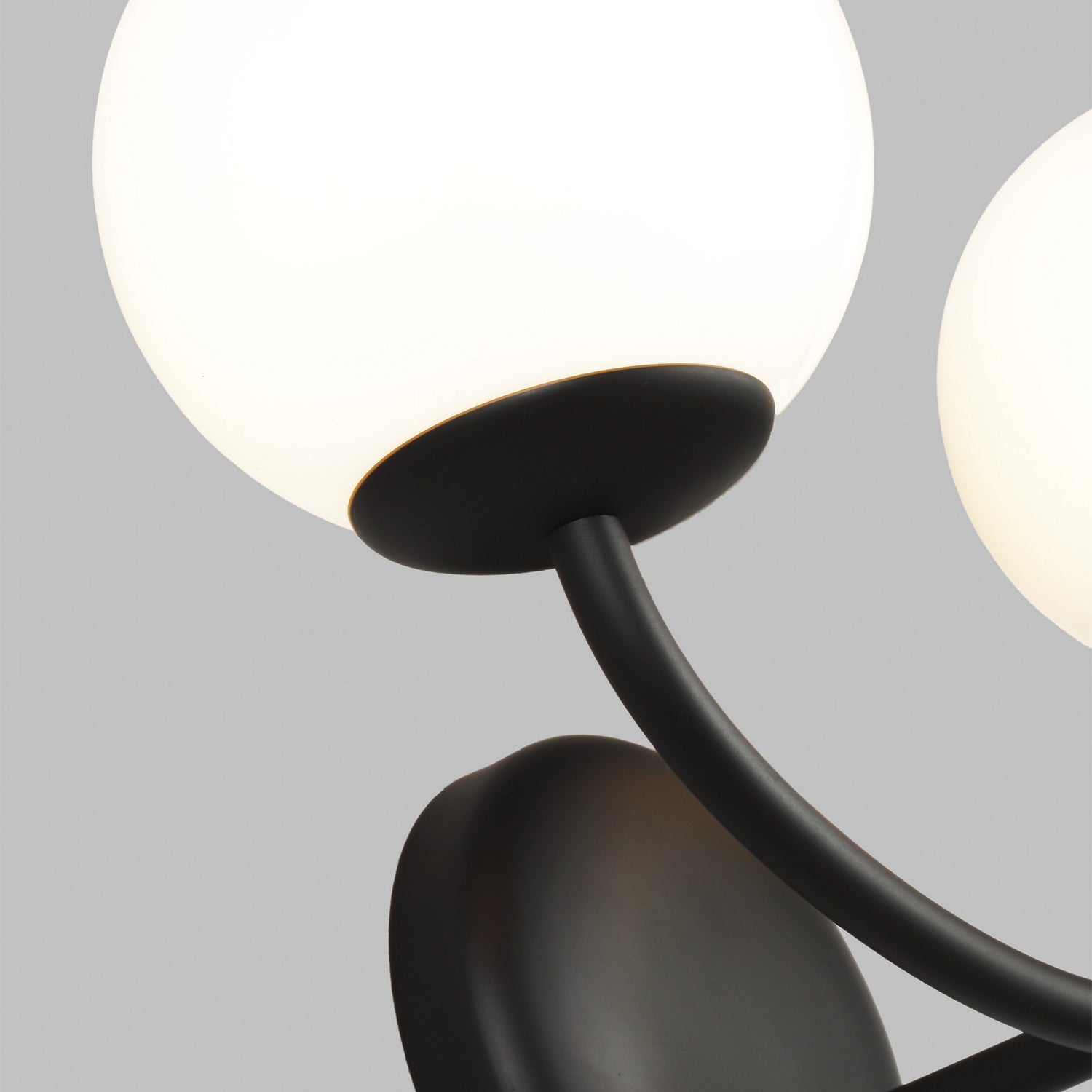 The Galassia two light wall sconce by AERIN in midnight black perfectly balances a glass globe and curving teardrop frame, giving it a contemporary look. Th