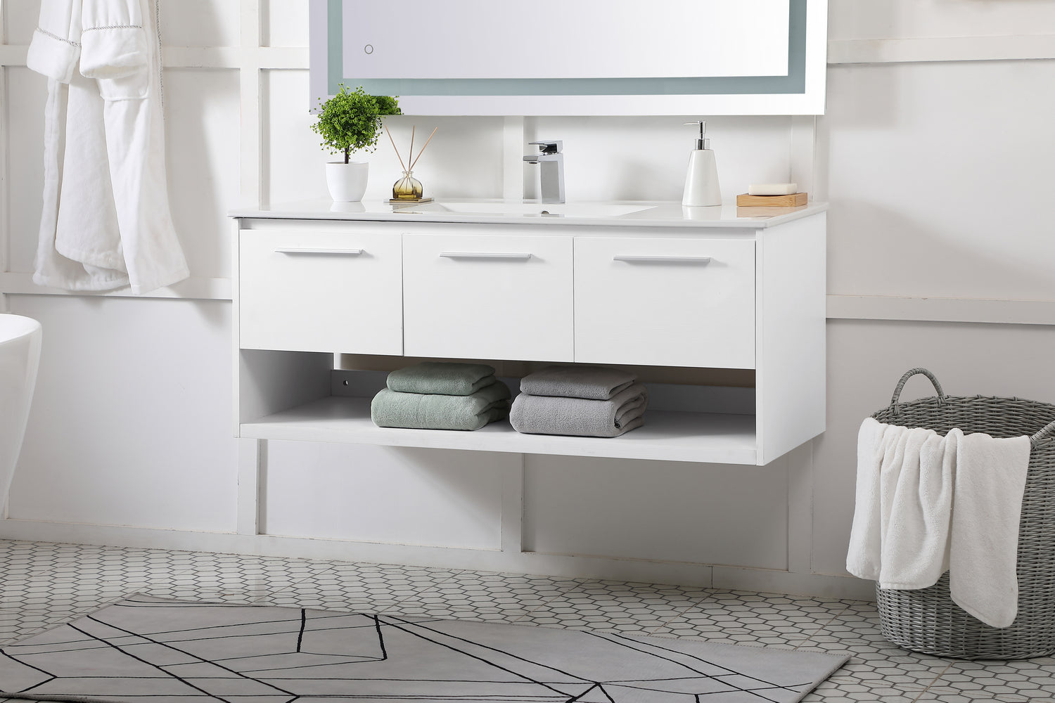Save space and make your bathroom appear bigger with this 48" floating vanity in a white finish. Its minimal design will have you in awe, while its clean lines will leave your room feeling fresh and uncluttered. The Single u-drawer and 2 cabinet doors pulls out for storage while the open space below allows you to place extra towels or various other essentials.