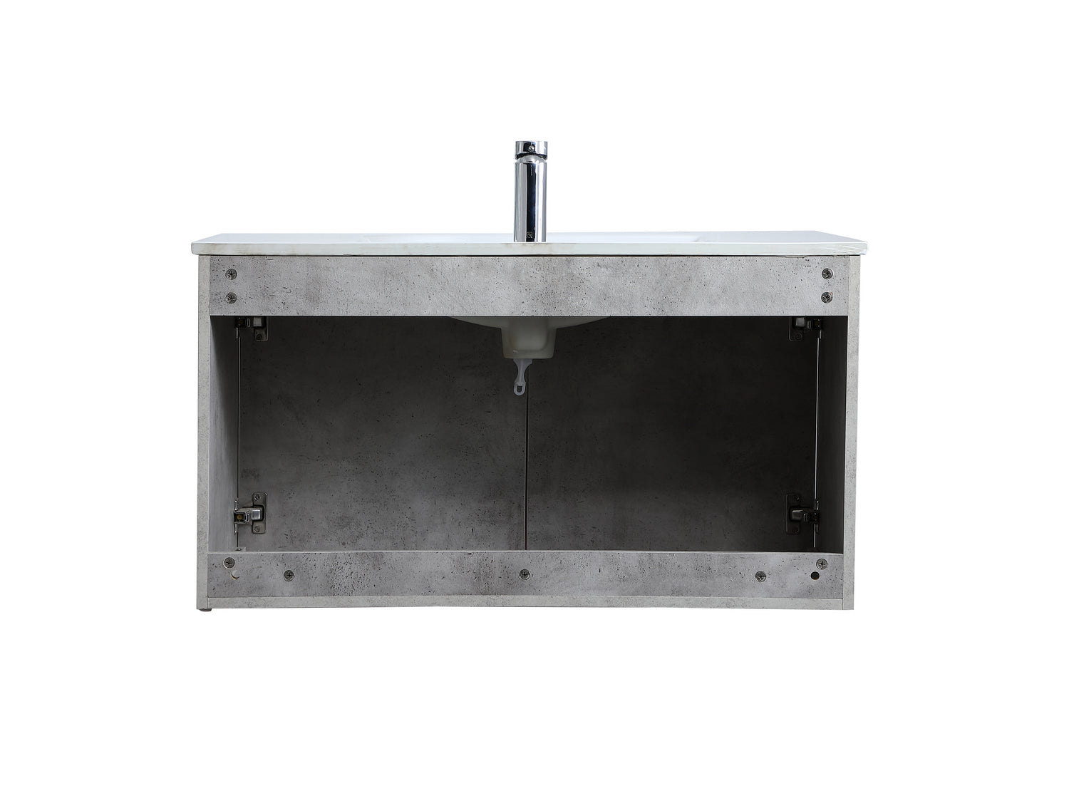 The contemporary simplicity of this 36" floating vanity in a concrete grey finish will help open the space and add stunning modern flair to your bathroom or powder room. The open space below makes it easy to show off your tiles and to clean the floor with ease--it's also the perfect place for a hamper. Double doors open to reveal plentiful of storage pace to store all of your bathroom miscellany. The clean lines that permeate through the design will surely create a fresh look in your home.