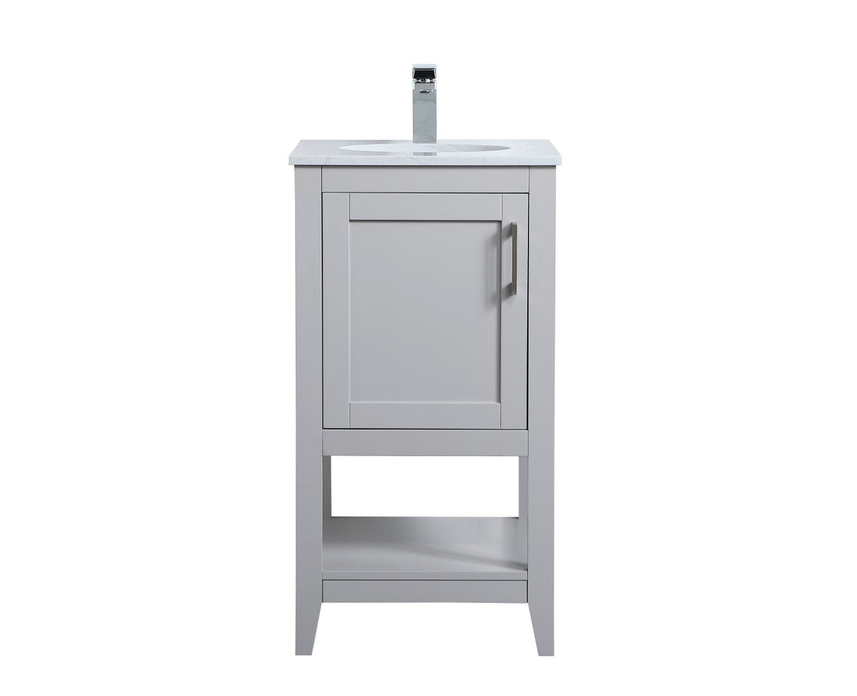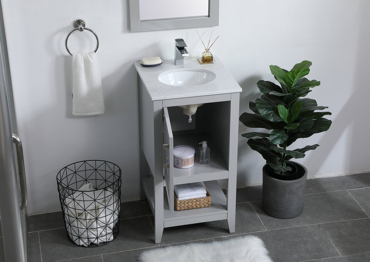 The nonchalant attitude of this 18" traditional grey finish vanity will have you wanting more. The slender brushed nickel handle bar open the cabinet door to reveal an ample storage space to put away and store bathroom essentials, and the open space below allows for you to place clean towels on the rack. Topped with a Calacatta engineered marble countertop, you and your guests will enjoy this easy going vanity.