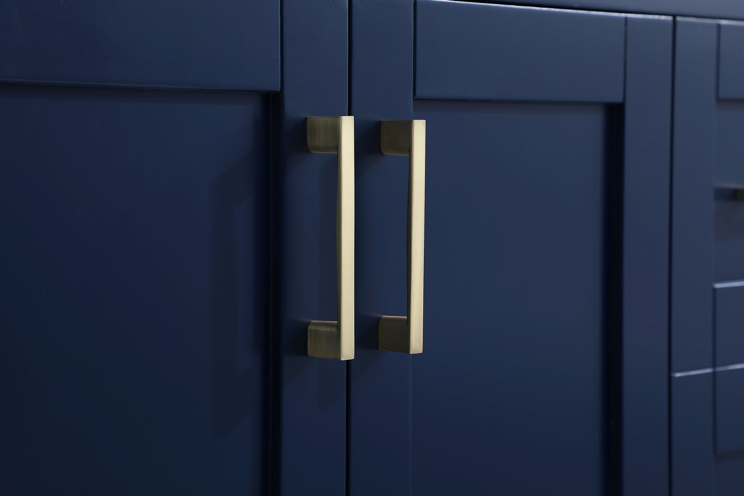 The nonchalant attitude of this 36" traditional Blue finish vanity will have you wanting more. The slender gold handle bars open the 3 cabinet doors to reveal ample storage space to put away and store bathroom essentials, and the open space below allows for you to place clean towels on the rack. Topped with a Calacatta engineered marble countertop, you and your guests will enjoy this easy going vanity.