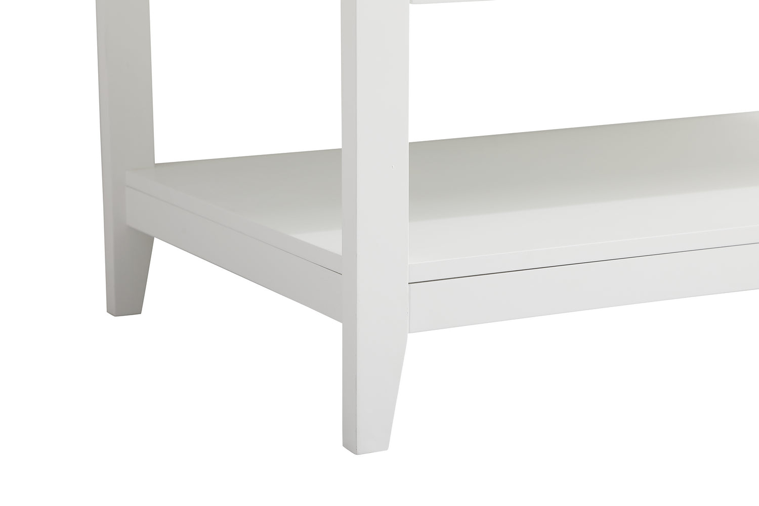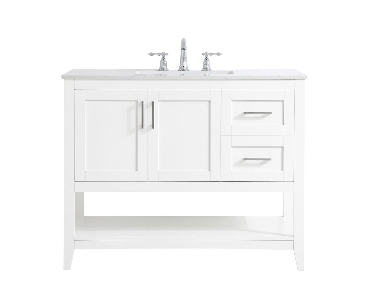 The nonchalant attitude of this 42" traditional white finish vanity will have you wanting more. The slender brushed nickel handle bars open the 3 cabinet doors to reveal ample storage space to put away and store bathroom essentials, and the open space below allows for you to place clean towels on the rack. Topped with a Calacatta engineered marble countertop, you and your guests will enjoy this easy going vanity.