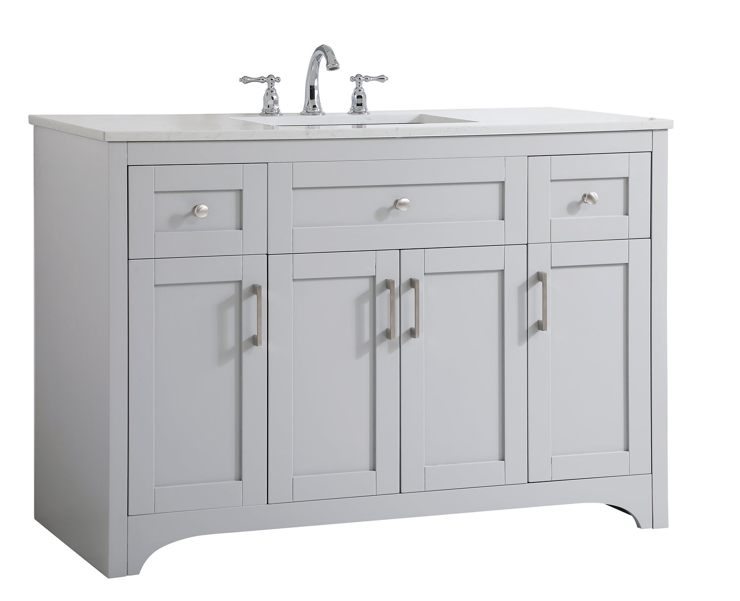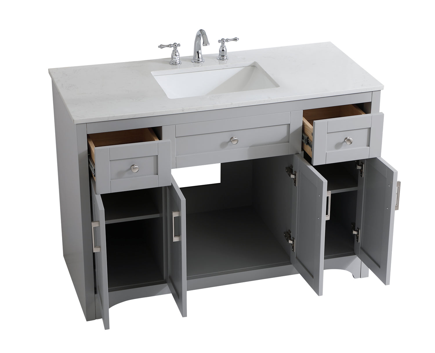 The refined simplicity of this 48" grey finish vanity creates a peaceful, yet stylish, atmosphere. Its traditional modernity adds a mature beauty that will elevate any bathroom or powder room--the Calacatta engineered marble counter top adds refined luxe while the brushed nickel handle bars open the 4 cabinet doors and 2 upper drawers, revealing ample storage space to store and hide away an assortment of bathroom essentials. Whether your home is large or small, this vanity will surely fit in well.
