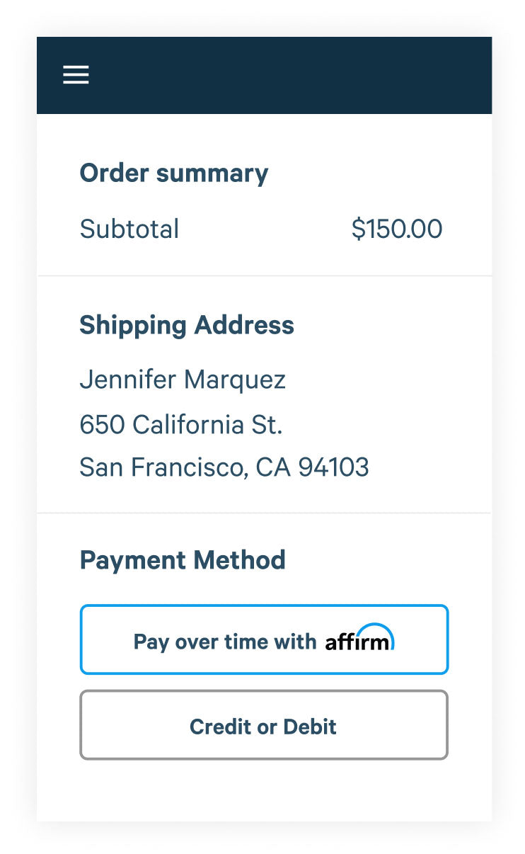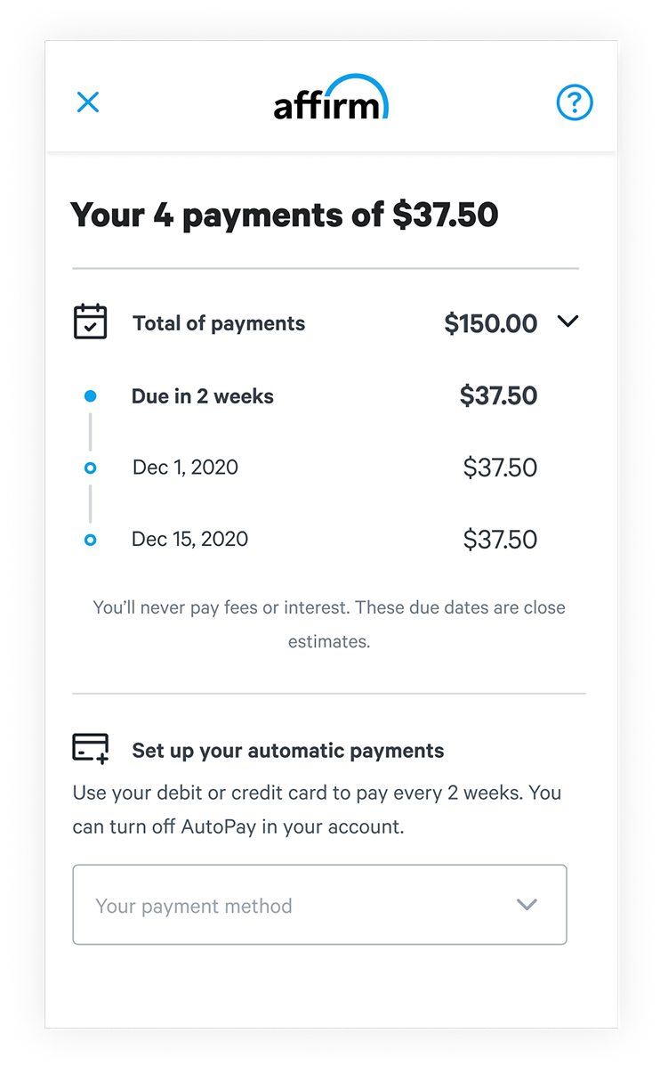 When you buy with Affirm, you always know exactly what you'll owe and when you'll be done paying. You’ll never pay a hidden fee—or any fee, for that matter.